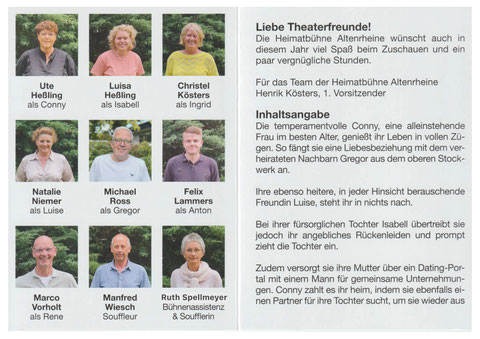 In diesem Jahr bringt die beliebte Theatergruppe die plattdeutsche Komödie „Conny un de Keerls“ von Bernd Spehling, plattdeutsche Übersetzung von Wolfgang Binder auf die Bühne. Das Stück verspricht, mit einer humorvollen und pointierten Darstellung einer alleinstehenden Frau im besten Alter, die ihr Leben in vollen Zügen genießt. Eine Liebesbeziehung mit dem verheirateten Nachbarn aus dem oberen Stockwerk, lebens-frohe Freundin, vorgetäuschte Krankheiten, fürsorgliche Tochter und fremdgesteuerte Partnersuche über ein Dating-Portal sorgen für kurzweilige, schwungvolle und abwechslungsreiche Verwechslungsmomente.